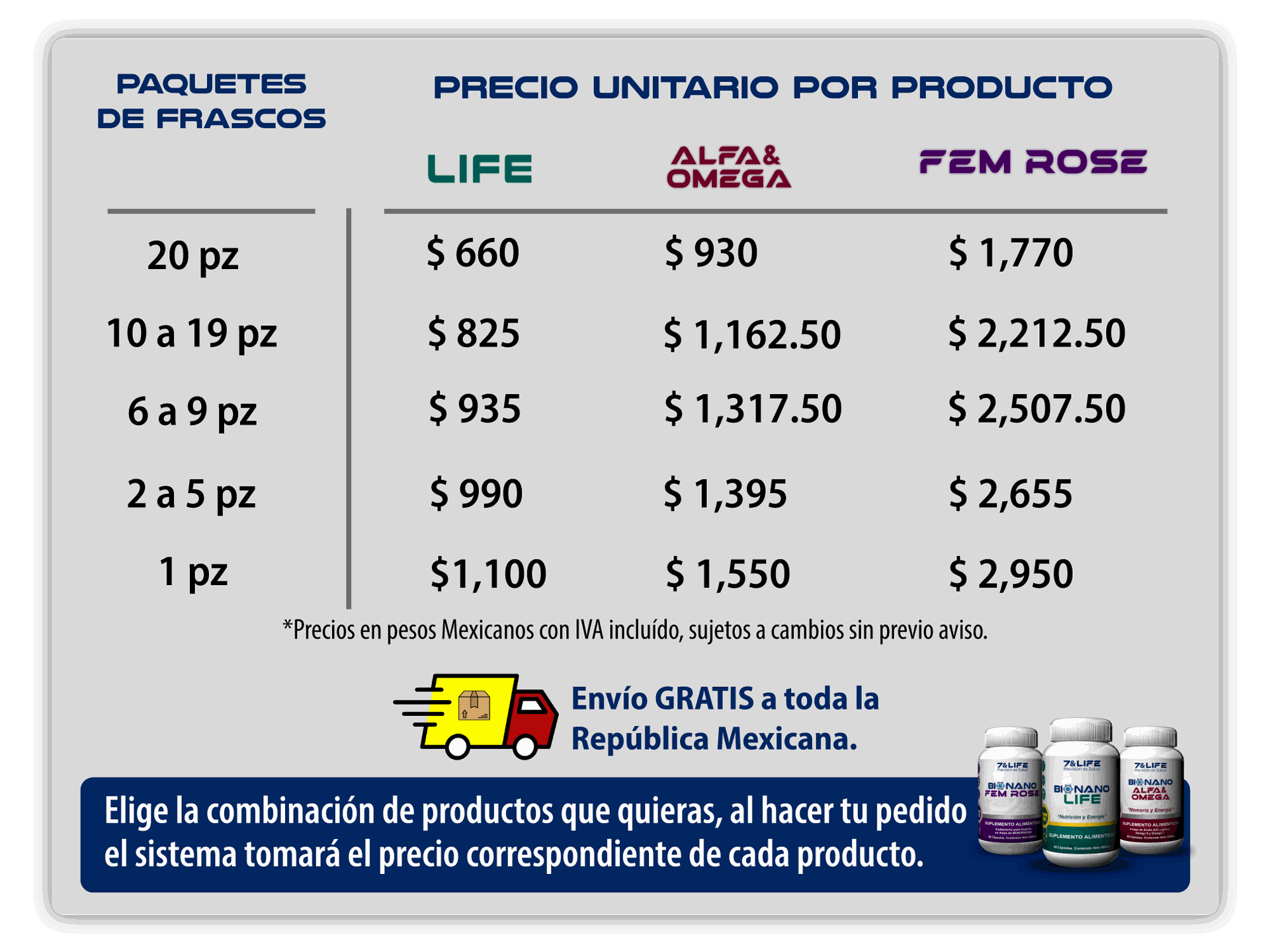 - Los precios especiales se calculan dependiendo la cantidad de frascos adquiridos sin importar la combinación.