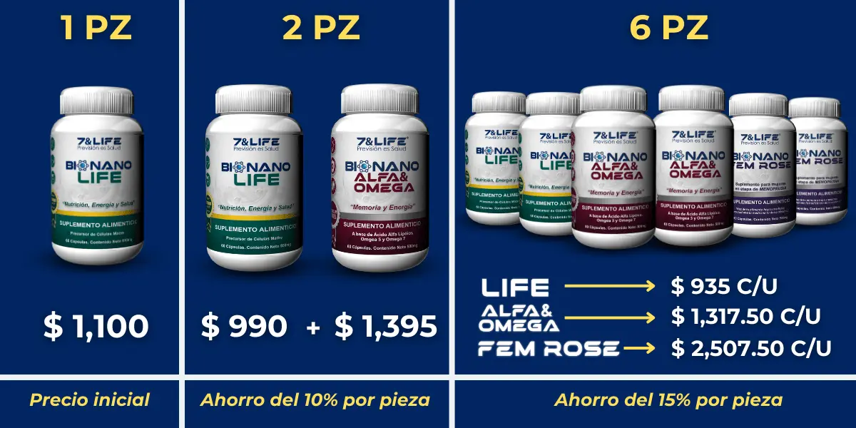 Si compras 6 suplementos LIFE + 3 suplementos ALFA & OMEGA + 2 suplementos FEM ROSE para tu familia, obtienes una excelente oferta por volumen. “Ahorro: 15%” en cada unidad comparado con el precio normal.