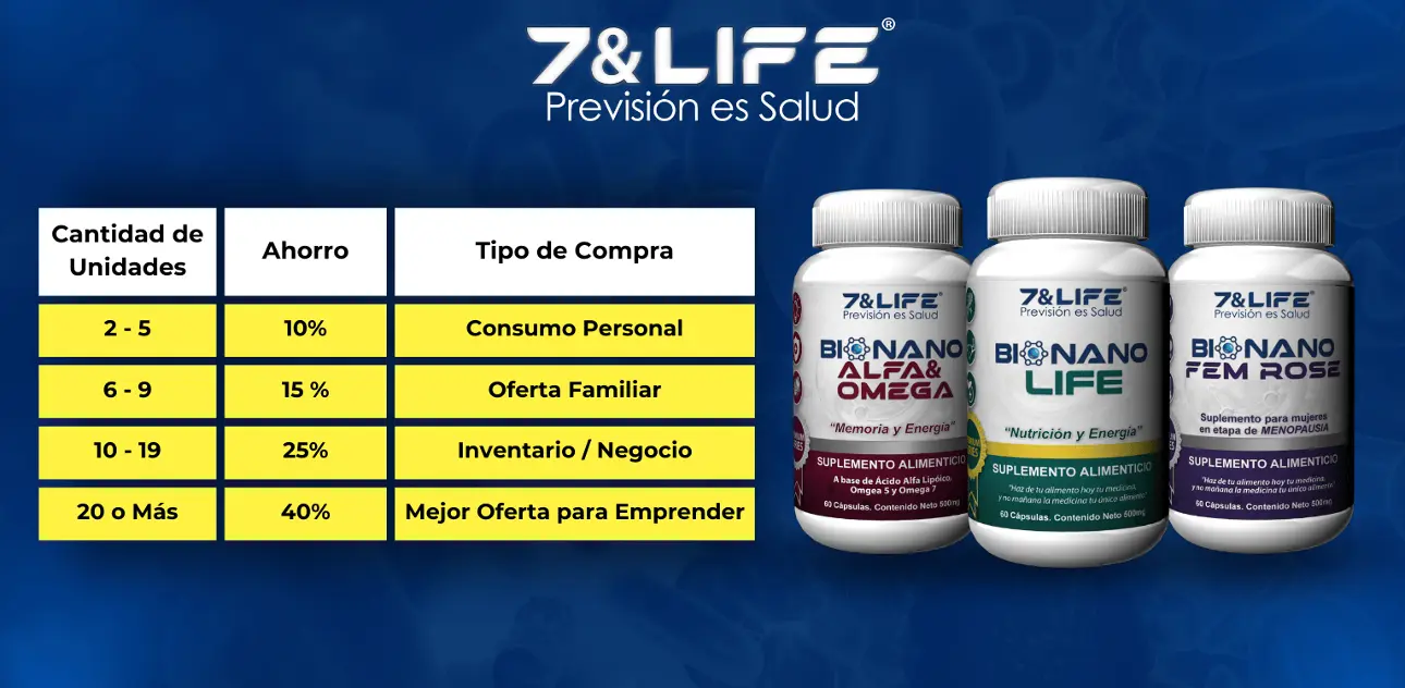 Si compras 20 o más unidades o combinación de cualquier producto BIONANO, obtendrás “el precio más bajo por unidad”, lo que te permite maximizar tus ganancias si decides revender los productos. “Ahorro: 40%” por unidad.